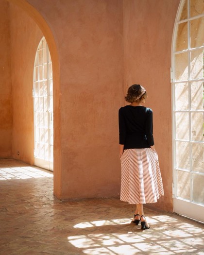 Maglia in tulle. Gonna in crêpe di lana. Cintura elastica. Bracciale. E poi fate la giravolta.